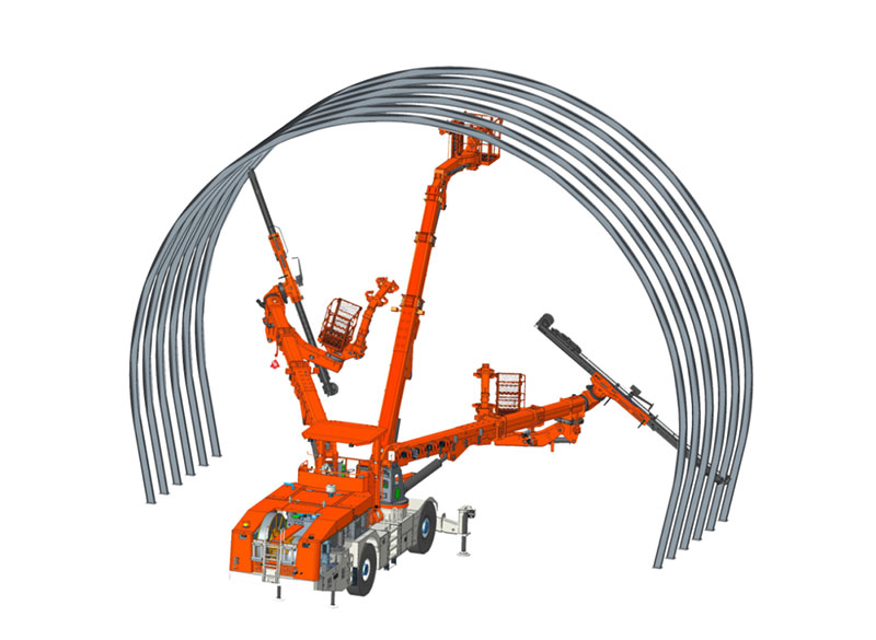 雙鑿巖拱錨臺(tái)車(chē)融合拱架施工與錨桿施工為一體,適應(yīng)各種規(guī)格鋼拱架安裝、錨桿施工、輔助裝藥平臺(tái)、輔助撬毛和通風(fēng)管作業(yè)等多功能,滿足在鐵路、公路隧道內(nèi)安裝單榀/多榀鋼拱架的規(guī)范性及安全性要求,滿足單洞單線、雙線、三線單次開(kāi)挖(全斷面、臺(tái)階法)一次性鋼拱架安裝距離要求。